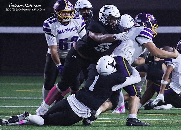 The Barker/Roy-Hart duo of Jakob West (55) and Ashton Ark (1) sack York/Pavilion quarterback Parker Bonafede for a loss.