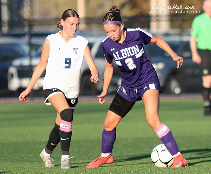 Photo by Cheryl Wertman – Albion’s Ava Woolston works to keep the ball away from Newfane’s Stephanie Chunco during this afternoon’s Homecoming game at Albion. Newfane scored a 2-0 win as Chunco scored what proved to be the game winner in the second half on a penalty kick and Pearl Tubo tacked on an insurance tally. Newfane is now 3-6 and Albion 0-5-3 in Niagara-Orleans League competition.