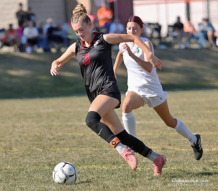 Photo by Cheryl Wertman – Eight players contributed goals as front-running Wilson downed an undermanned Medina squad 11-1 in a Niagara-Orleans League girls soccer game at Vets Park this morning. Here Wilson’s Lilly Gurski works around Medina defender Lillian Maynard. Addison Elia scored three goals and Gurski two to lead Wilson. Tessa Costich scored for Medina off an assist from Arabella White. Wilson is now 9-0 and Medina 0-7 in N-O action.