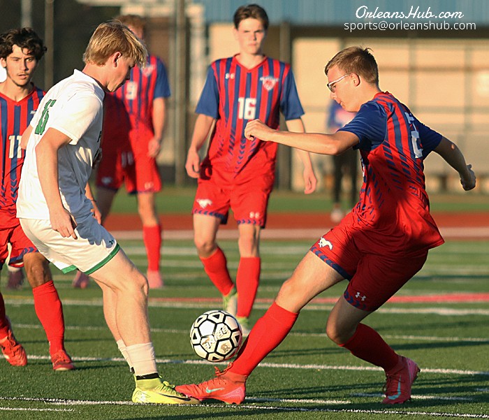 Photo by Cheryl Wertman – Medina’s Decklan Meiers kicks the ball away from Pembroke’s Austin Post during the Mustangs non league win at Vets Park this evening.