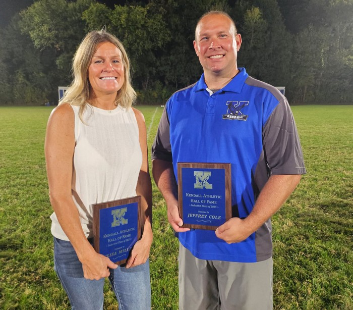 Contributed Photo – Kendall High has inducted two new members into the Eagles Athletic Gall of Fame – Elisa Miller, Class of 1996 and Jeff Cole, Class of 2001. Miller was a three sport star in soccer, basketball and softball. She earned All State honors in soccer and was named Kendall’s Female Athlete of the Year her senior year. She went on to earn soccer All American honors at both Monroe Community College and Roberts Wesleyan. She has continued to serve Kendall athletes by serving as President of the Sports Boosters. Cole was a three sport star in soccer, basketball and baseball. He earned All State honors in soccer and was named to the sectional basketball All Tournament team. He now serves the community as a deputy with the Orleans County Sheriff’s Department’s K-9 unit.