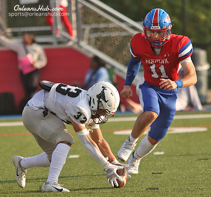 Photos by Cheryl Wertman – Barker/Roy-Hart’s Anthony Adinolfe recovers a fumble by Medina quarterback Preston Woodworth which he returned for the Bulls first touchdown in a 29-22 win over the Mustangs at Vets Park this evening.