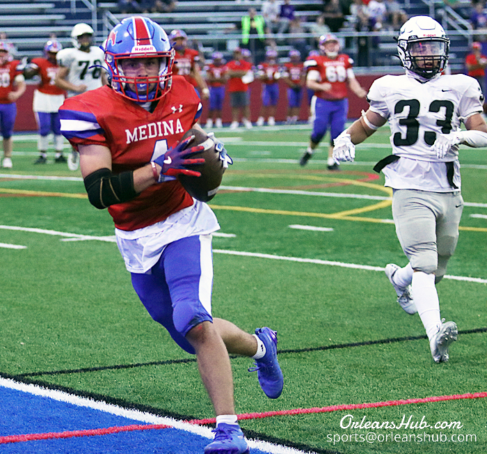 Medina’s Kolton Fletcher scores the second of his three touchdowns.