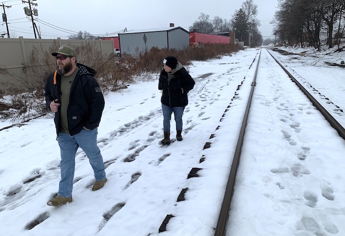 Photo by Tom Rivers: Albion village trustee Tim McMurray and Jami Allport, executive director of the Genesee-Orleans Ministry of Concern, on Jan. 25, 2024 walk along the railroad tracks in Albion between Main Street and West Academy Street. They were among several agency and government leaders out that day trying the measure the homeless population in the community. Allport offered gift cards to Tops, as well as snacks, blankets and gloves. GOMOC for the past year has made backpacks with supplies available to the local unhoused population. The backpacks were purchased with a grant from the Greater Rochester Health Foundation.