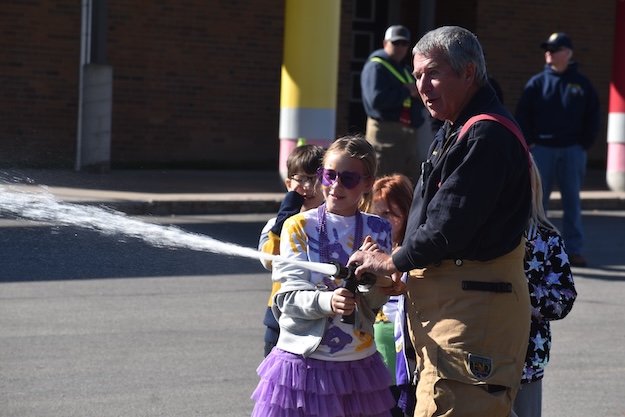ALBION – Barre firefighters, Dylan Parker at left and Barry Flansburg at right, assist fourth-graders in spraying water from a fire hose at targets. It was part of a Fire Prevention Week at the school.