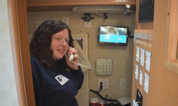 Brianna Caldwell, an Albion firefighter, simulates being a dispatcher and takes a 911 call.