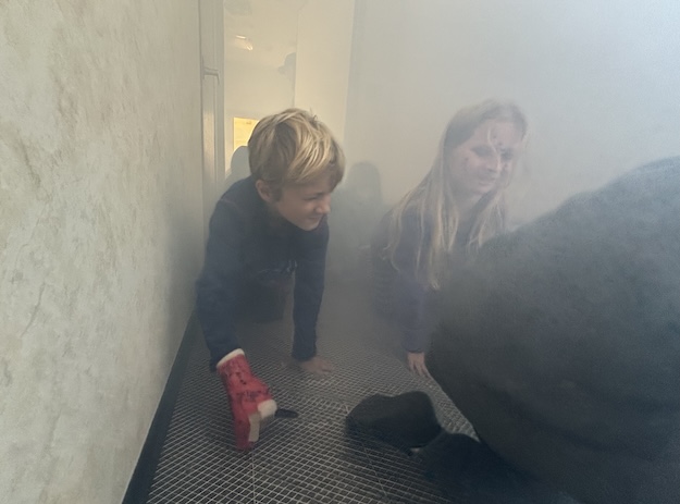 Students go through smoke simulator, spray water from fire hose