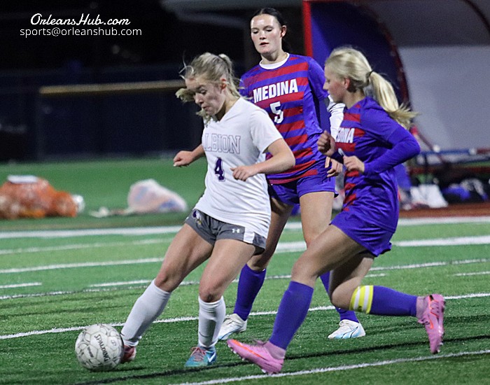 Photos by Cheryl Wertman – Albion’s Shayla Higgins works around Medina defenders Lucia DiCureia (5) and Lillian Maynard (2) during this evening’s game at Vets Park.