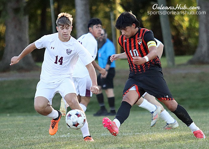 Photo by Cheryl Wertman – Two lightning quick goals in the first four minutes, one on a header off a corner and the other on a breakaway, sparked Byron-Berge/Elba to a 5-1 win over host Lyndonville in a Genesee Region League boys soccer game this afternoon. Here Jesus Reyes, who scored the Tigers lone goal, advances the ball against the Bees Bing Zuber.
