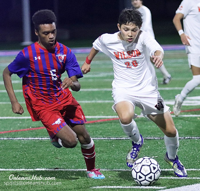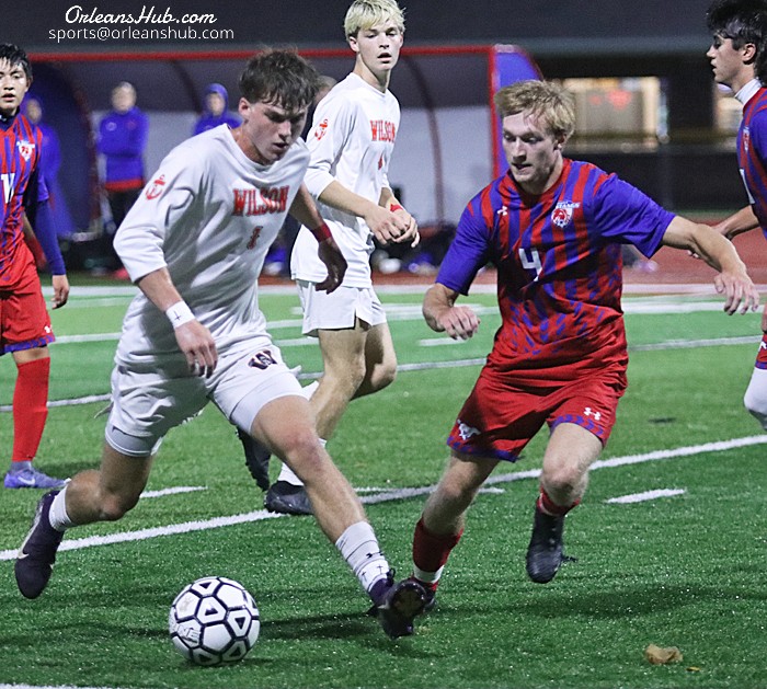 Photos by Cheryl Wertman – Wilson’s Aidan Neumann, who scored the game’s lone goal, advances the ball against Medina defender Ryan Pegelow.