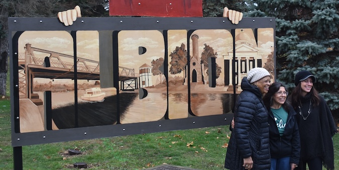 The “ALBION” sign features the a boat on the Erie Canal with the lift bridge in back, the Civil War memorial tower at Mount Albion and the Orleans County Courthouse.