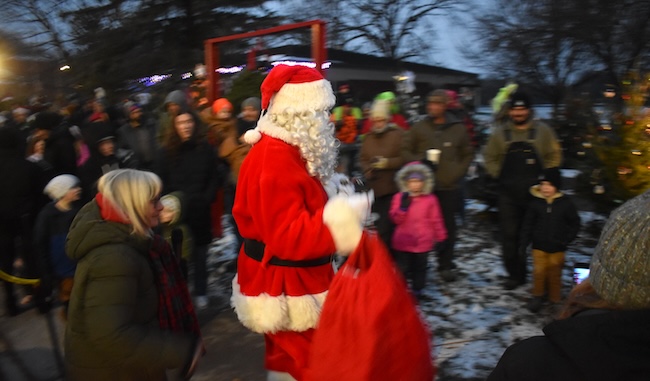 Carla Woodworth, left of Santa, served as emcee on Saturday and helped guide Santa to the “North Pole” electric switch so he could turn on the power for all the trees.