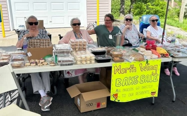 Photos courtesy of Scott Robinson: Adrienne Belson, center, activities director and MDS coordinator at Orleans Community Health, sits with residents of the North Wing during a bake sale she helped organize last summer. Belson was one of three North Wing employees recognized during National Activity Professionals Awareness Week.