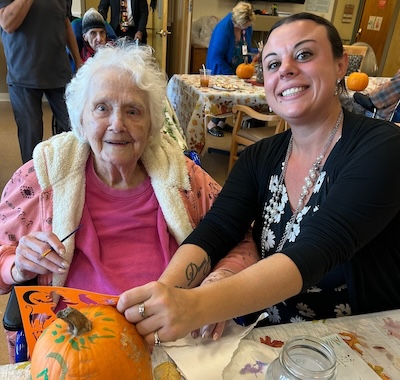 Activities Assistant Angel Mackey helps a North Wing resident paint a pumpkin during a special fall activity. Mackey was another employee who received recognition at OCH this week.