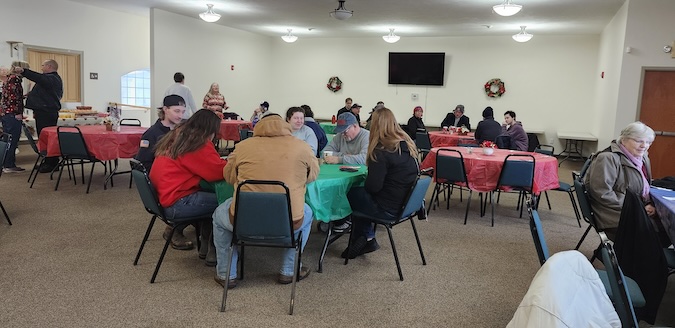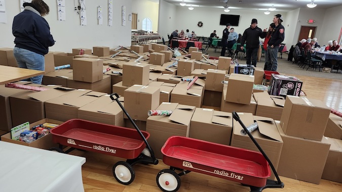 Photos by Ginny Kropf: A sea of boxed food and gifts is ready for firefighters to begin delivering as soon as they finish their breakfast at The Grove United Methodist Church on Saturday morning.