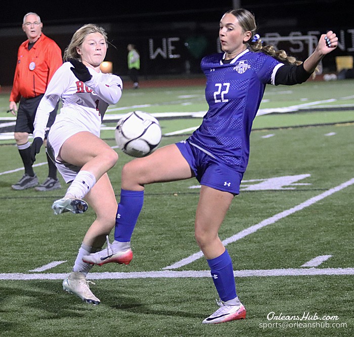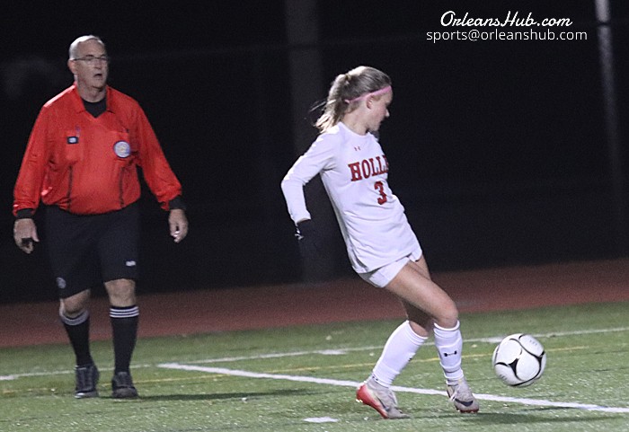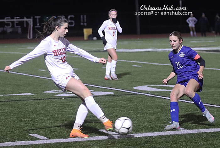 Photos by Cheryl Wertman – Holley’s Jayna Burris lets loose with a shot to score the only goal the Lady Hawks needed in the win over top seeded Geneseo this evening at Avon.
