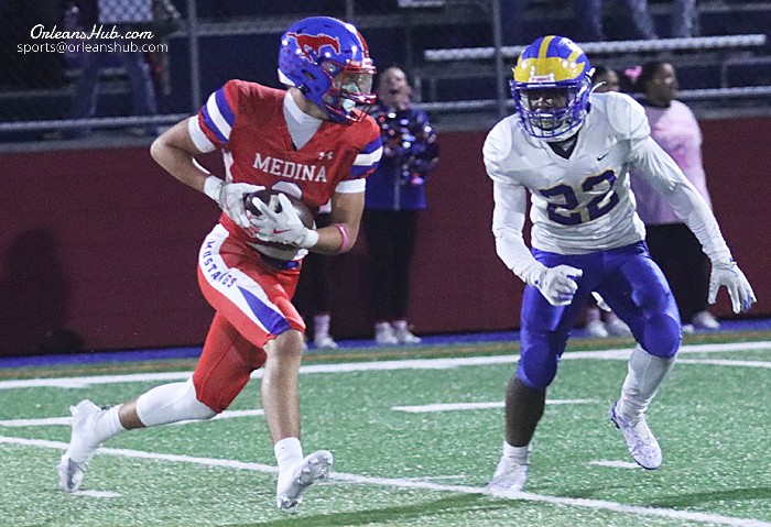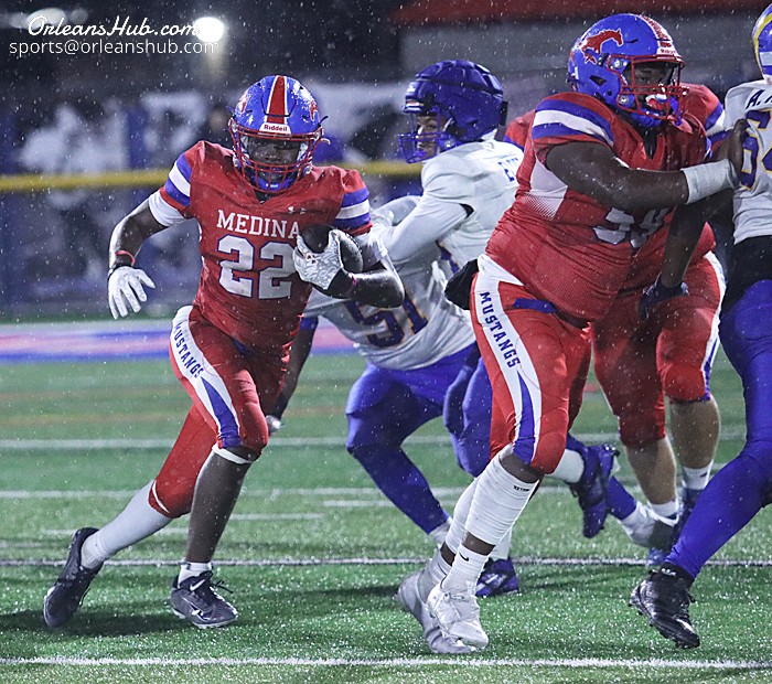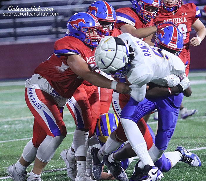 Medina raced out to a 21-0 first quarter advantage ignited by a 68 yard touchdown pass from quarterback Preston Woodworth to Hadrian Batista on the Mustangs second play of the game. Davi Mucoucah tacked on the first of his six extra point kicks.