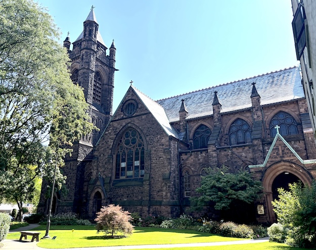 Christ Church in Rochester was founded as an Episcopal parish in 1854. The cornerstone of Gothic Revival edifice was laid in 1883. The church at 141 East Ave. was built in stages between 1883 and 1894, using rock-faced red sandstone from Albion. The Johnson Tower, the tallest part of the church, was added in 1903.
