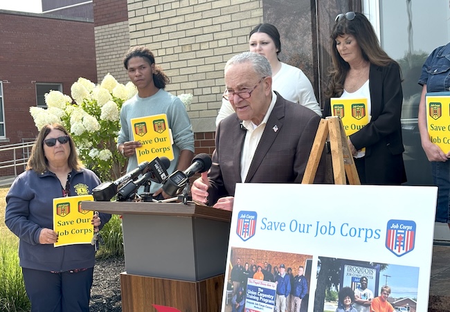 “We’re all here with one single message: We want to save the Iroquois Job Corps Center,” Schumer said. “We got to save it if we want our young people to have a future. We don’t want them to have a handout. We want them to have a future. They should know if they work hard and learn a skill they can get a good-paying job to support a family and be proud parents and proud spouses. That’s what this center has done for so long.”