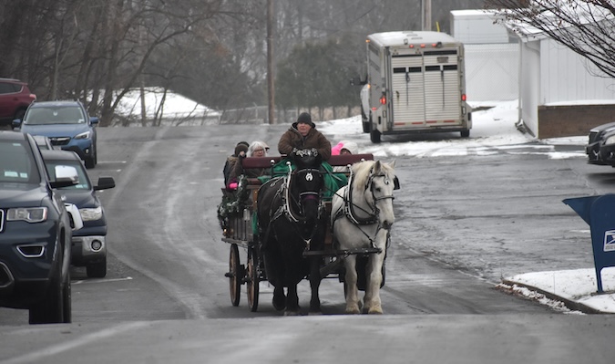 Dale Jenks of Hartland Carriage in Gasport guides a pair of Percheron horses that pulled the carriage in Holley.