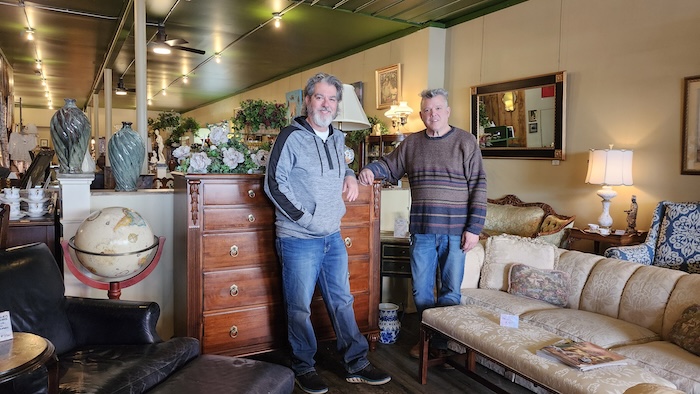 Photos by Ginny Kropf: Michael Prezioso, left, and Mario Campana stand among some of the antique furnishings in their new store on East Center Street in Medina.