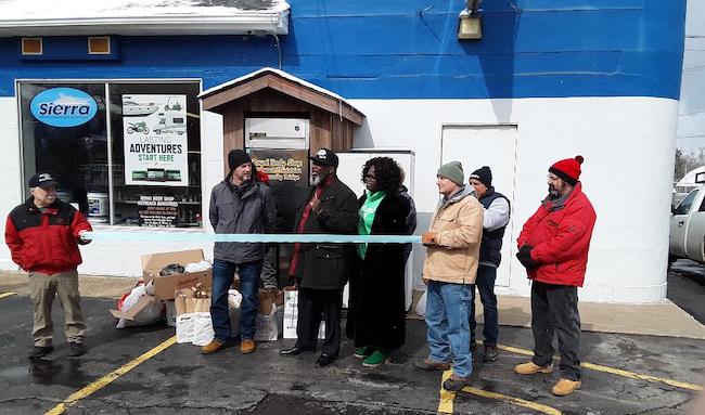 This photo is from March 2022 when community fridge was dedicated at Arnold’s Auto Parts. Village trustee at the time Stan Farone, left, participates in the ribbon cutting with Pastor Albert Wilson and his wife Ykeeta, center, Dan DeCarlo from Arnold’s Auto Parts and other volunteers including Kevin Lemcke and Jack Burris of Hands 4 Hope.
