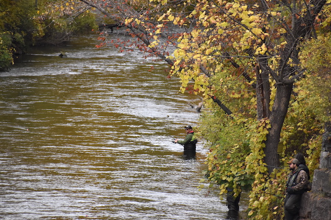 Photo by Tom Rivers: Anglers try to catch salmon and trout in the Oak Orchard River in Carlton on Oct. 20, 2023.