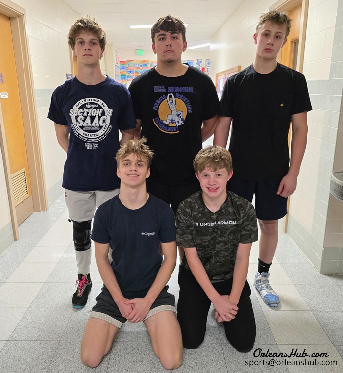 Photo by Cheryl Wertman – The Holley-Kendall wrestling squad’s veteran group includes, in front, Carson Cady, Isaac Bartlett and Jayden Rivera. In back are Parker Denning, Immanuel Cornell and Brenden Eichas.