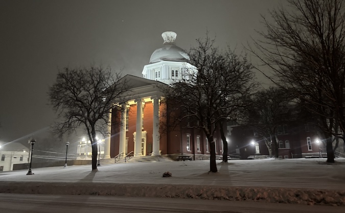 Photo by Tom Rivers: The Orleans County Courthouse is shown on New Year’s Eve when snow made traveling difficult.