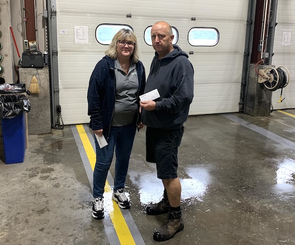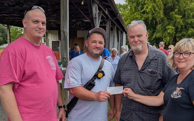 Becky Persons of ABATE presents a $500 check to Bob Freida, fire chief of the Clarendon Volunteer Fire Company.
