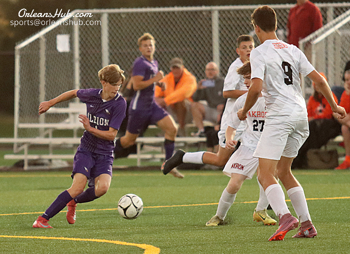 Completing a home and home season series sweep in a span of only three days, Akron downed host Albion 2-0 in a Niagara-Orleans League boys soccer game this evening.
