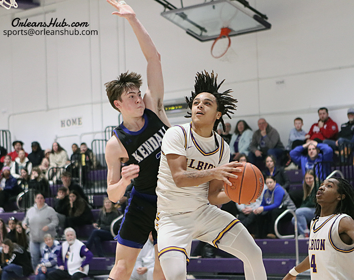 Photos by Cheryl Wertman – Albion’s Elijah Doxey goes in to score what proved to be the game winning three point play as CJ D’Agostino defends for Kendall. The Purple Eagles rallied with a big fourth quarter to nip the Eagles 62-61.
