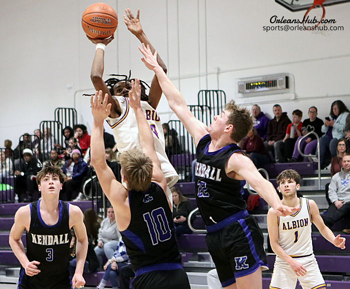 Tyler Cody puts up a shot in traffic for Albion as Vinnie D’Agostino (10) and Noah Morehouse (22) defend for Kendall.