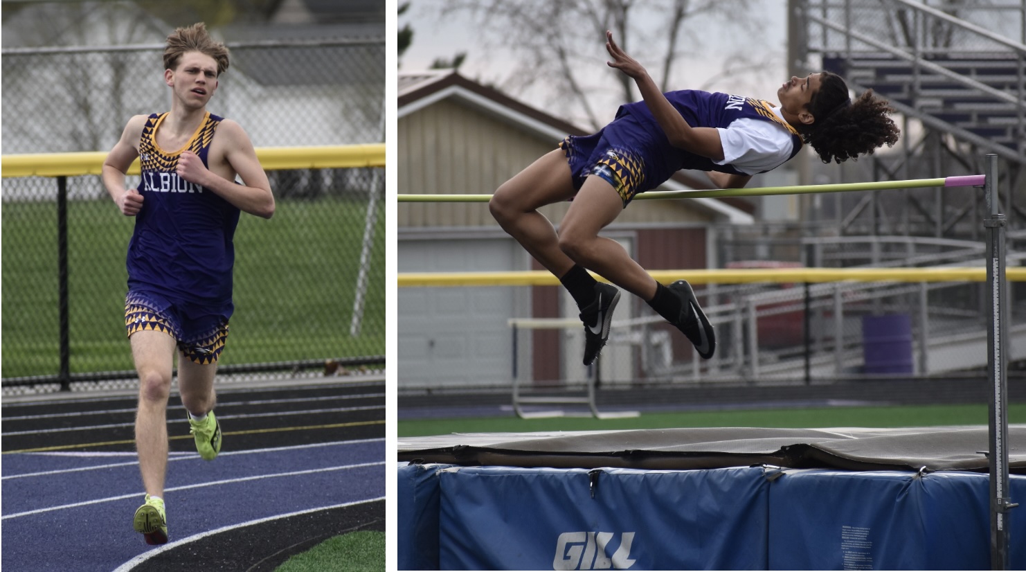 Photos by Tom Rivers: (Left) Tristian Tilbe won the 1600 meter boys race today for Albion today in 4:59. (Right) Ezra Bloom clears 5 feet, 4 inches in this leap with the high jump. He would finish second in the event.