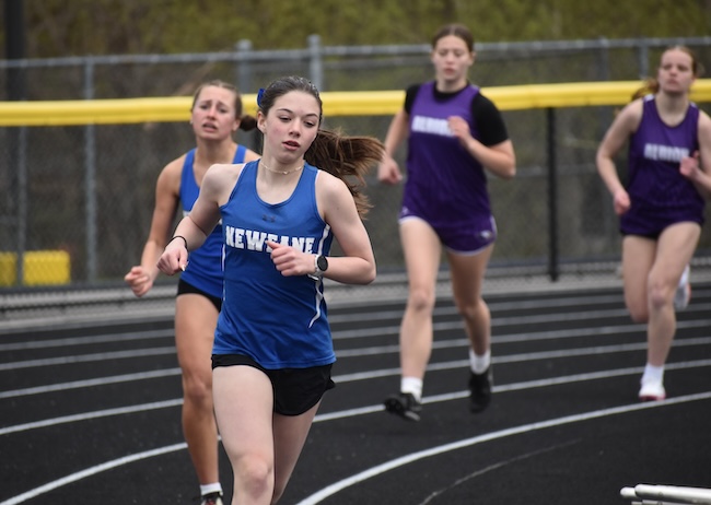 Eden Hillman of Newfane is out in front in the 800 meter race. She won that event plus the 1500, 3000 and pole vault in today’s meet at Albion.