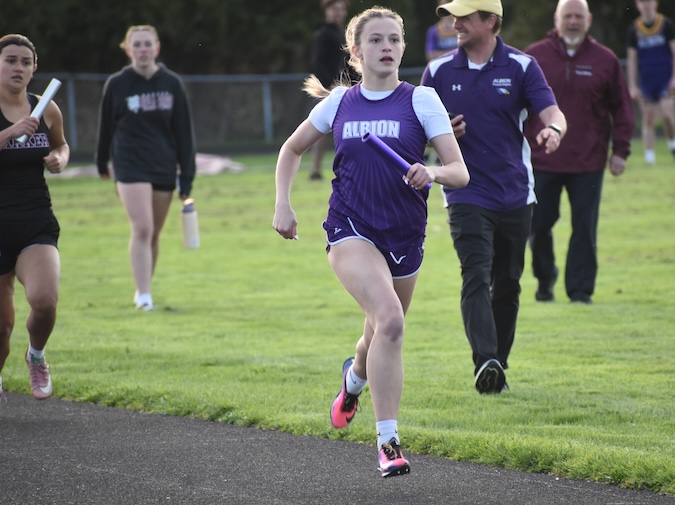 A win in the 1600 relay by the foursome of Hannah Olles, Brianna Lewis, Mia Standish and Aubrey Bruning locked up the win for the Albion girls squad which is now 2-1.