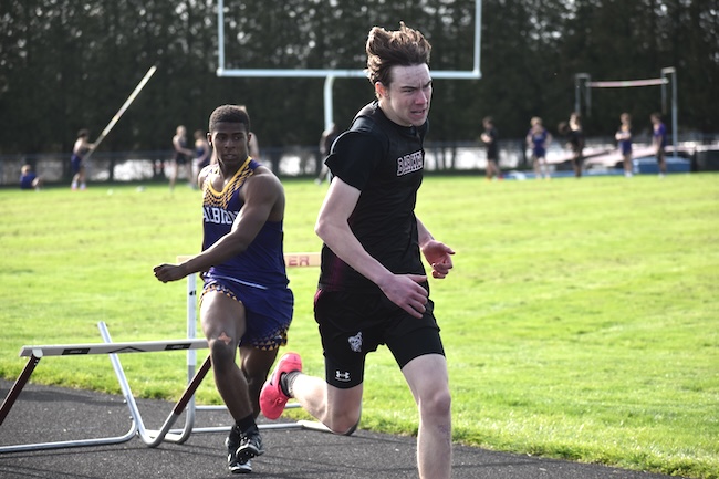 Blake Carnes of Barker took first place in the 400 meter hurdles today, edging Jaxon Lynch of Albion who was second.