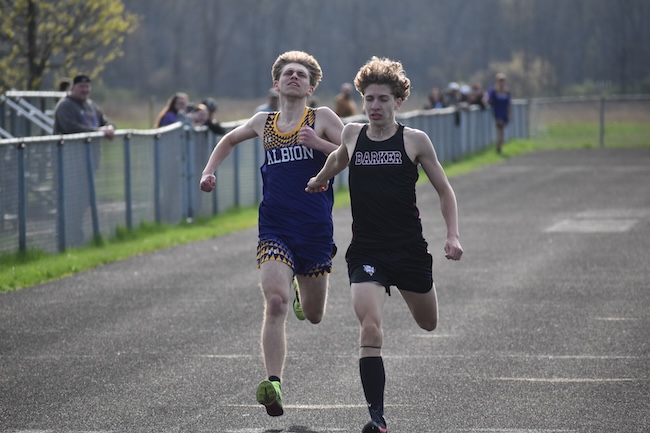 Logan Wagner of Barker finished just ahead of Tristian Tilbe of Albion for first place in the 800 meter race today in Barker.