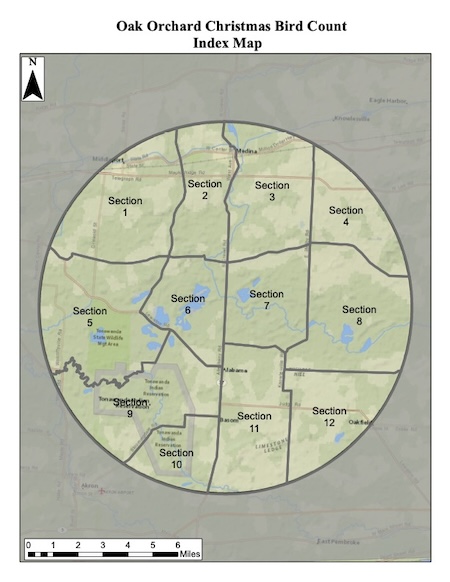 The Oak Orchard count circle is centered on Iroquois National Wildlife Refuge at the Orleans and Genesee County line on Route 63. Count volunteers follow routes staying inside the designated 15-mile diameter circle. The day’s total is not just a species tally; individual birds are counted, giving an indication of the total number of birds per species in the circle that day.