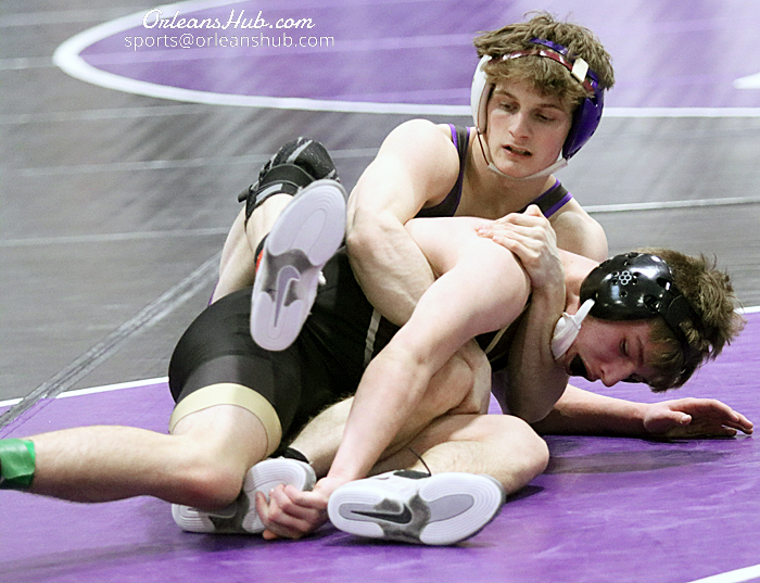 Photos by Cheryl Wertman – Albion’s Corbin Piccirilli works to score a technical fall win over Roy-Hart/Barker’s Remington Marohn during today’s Purple Eagle Duals Tournament.