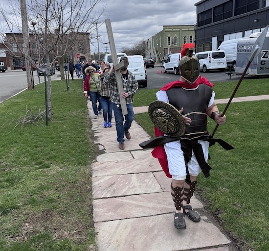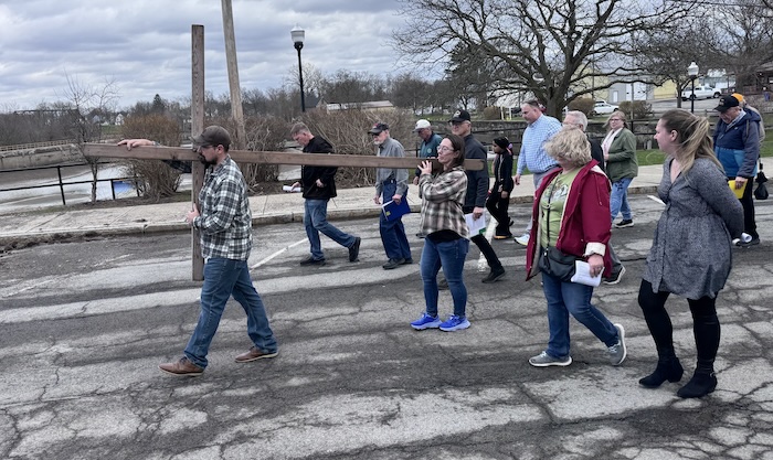 MEDINA – Matt Caldwell and his wife Rebecca carry the cross in the Canal Basin as part of today’s “Cross Walk” on Good Friday. The Cross Walk has been an annual tradition in Medina and is organized by the Medina Area Association of Churches and the Medina Clergy Fellowship.