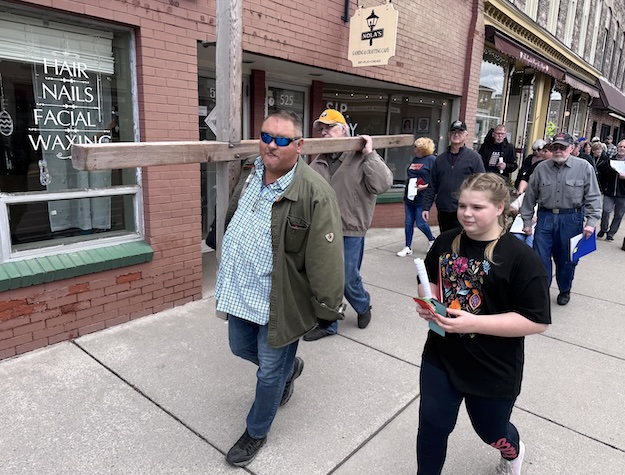 Mike Zaidel, a leader at Alabama Full Gospel Fellowship, carries the cross down the sidewalk on Main Street. They group was headed to Rotary Park.