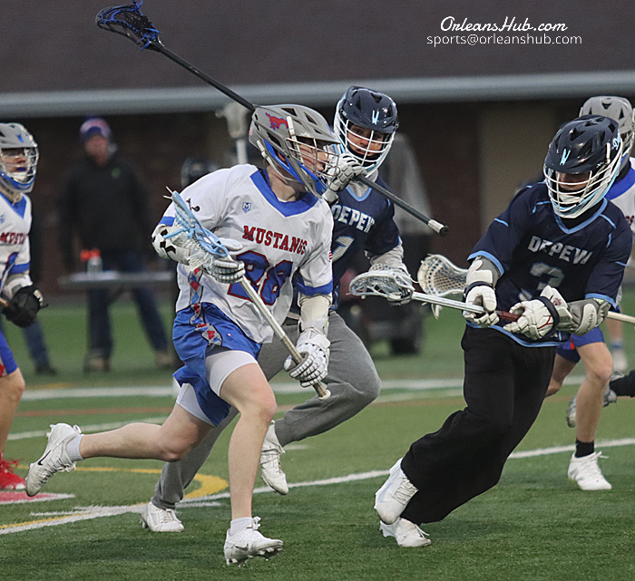Photos by Cheryl Wertman – Medina’s Luke Duffina drives to the goal against Depew defender Max Delano during the Mustangs loss to the Wildcats this evening at Vets Park.