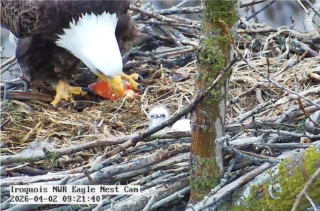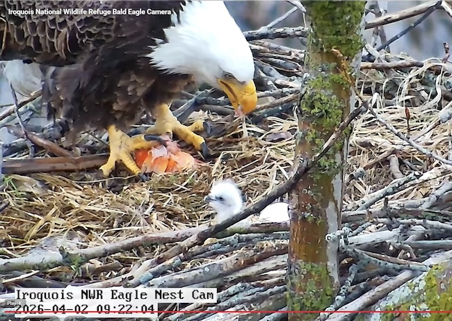 The eaglet was first seen on camera at 6:45 a.m. today, said Dick Moss, president of the Friends of the Iroquois National Wildlife Refuge.