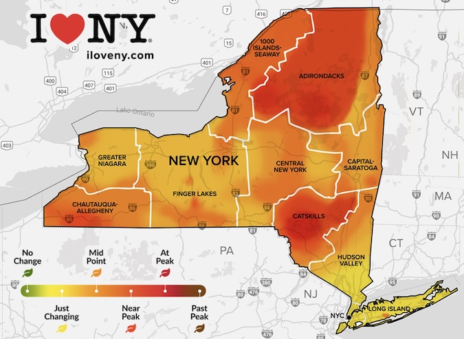 “Beautiful peak fall colors will continue to spread through the Adirondacks and Catskills, and are expected to arrive in some parts of the Chautauqua-Allegheny and Finger Lakes regions this weekend,” I Love NY posted on Wednesday.