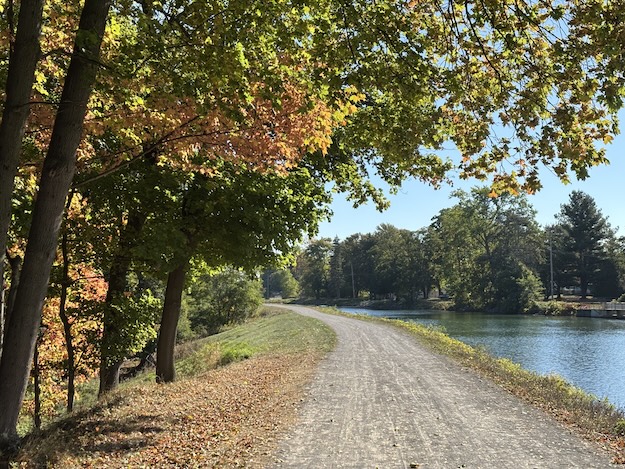 Photo by Tom Rivers: Some leaves on these trees are still green and others have changed to bright colors. This is a spot on the Erie Canal Towpath in Albion, east of the Ingersoll Street lift bridge.
