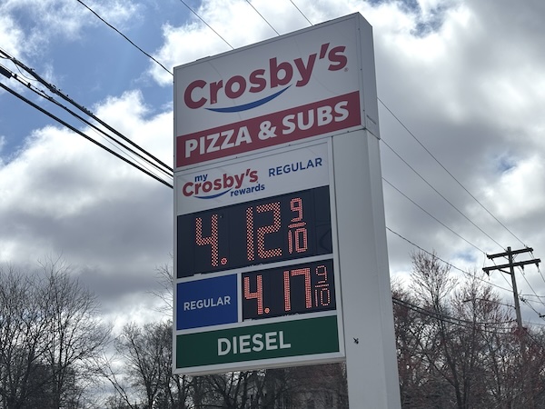 Photo by Tom Rivers: The price for regular unleaded was at $4.17 on Tuesday at the Crosby’s in Albion at the intersection of routes 98 and 31. The store gives a 5-cent discount for customers with the rewards card, which made the price $4.12. The cease fire with Iran dropped oil prices but the gas price didn’t go down as of this morning in Albion.