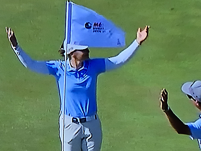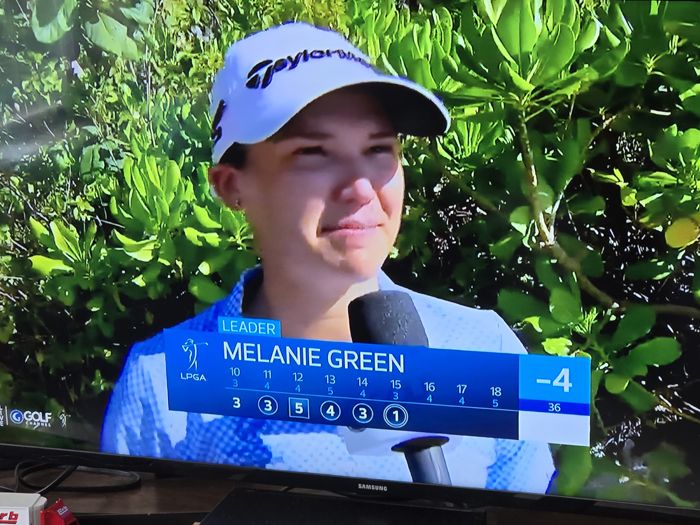 Green celebrates after scoring the hole-in-one, which was the first on this her debut season on the LPGA Tour. She followed up with a birdie on 17 to go to 5 under and increase her tournament lead to 2 shots. Getting good TV coverage as the leader it was mentioned that she was from Medina, NY.