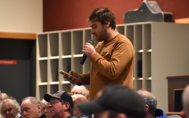 Photos by Tom Rivers: Rollin Hellner speaks during a Jan. 29 Medina Village Board held at the high school auditorium. At the meeting he faulted the board for poor planning with the purchase of a new ladder truck without having a spot to place it. During the meeting Hellner said he was running for mayor in the March 18 election, but he decided not to seek the position and is instead backing Deborah Padoleski, a retired village clerk-treasurer and current trustee. Padoleski on Feb. 9 made the motion to declare the ladder truck surplus, and two other trustees backed that motion.