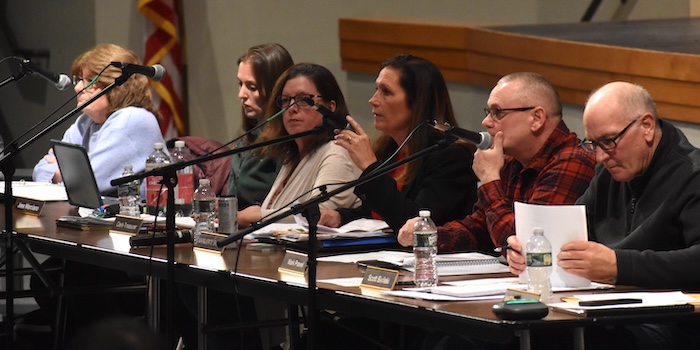 The Medina Village Board is shown during a meeting on Jan. 29 in the high school auditorium. From left include Trustee Deborah Padoleski, Trustee Jess Marciano, Village Clerk-Treasurer Jada Burgess, Mayor Marguerite Sherman, Trustee Mark Prawel and Trustee Scott Bieliski.